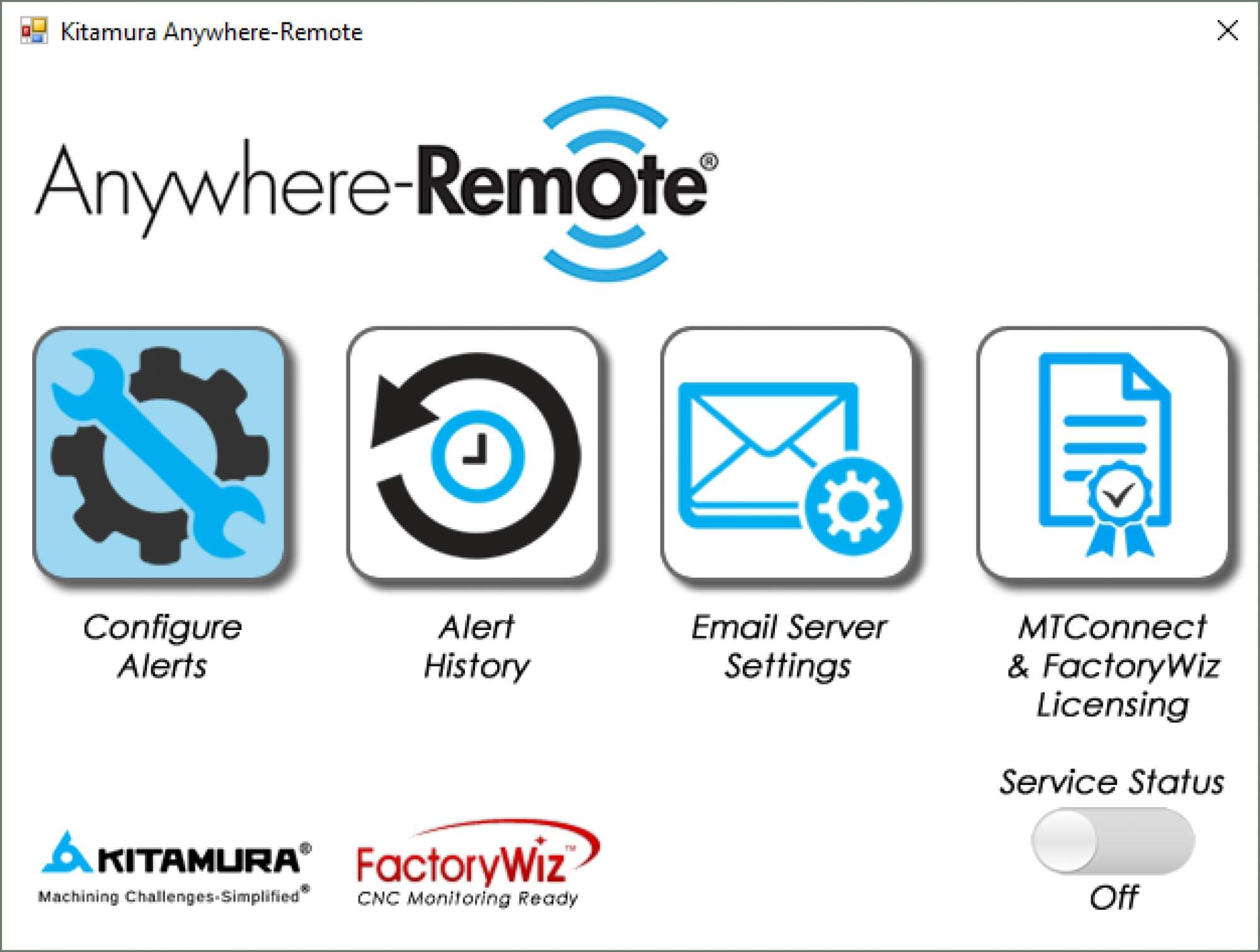 Wheeling, IL – September, 2017 Kitamura Machinery, the premier manufacturer of precision horizontal, vertical and 5-axis machining centers, announced today the availability of a new IoT platform Anywhere-Remote®. It includes E-mail status updates, machine monitoring software suites that range from basic plug and play packages to those that are customized to suit each individual customer’s application and MTConnect® ready adaptor (basic). All powered by, and in partnership with FactoryWiz™ Monitoring & DNC.
